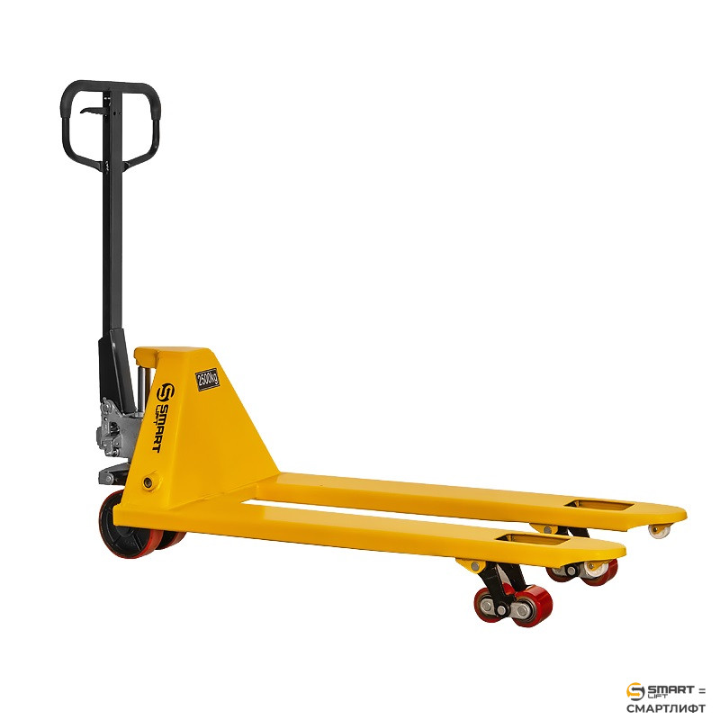 Тележка СМАРТЛИФТ (SMARTLIFT) SD (CBY-BF3.0) PDP оснащена полиуретановыми колесами увеличенного диаметра 180 мм и сдвоенными (тандемными) полиуретановыми роликами, что обеспечивает максимально комфортное передвижение тележки по ровным (наливным) полам. Конструкция крепления сдвоенных роликов позволяет легко преодолевать небольшие неровности, а наличие дополнительного ролика на конце вил делает удобной работу с паллетами поперёк. Для управления тележкой используется обрезиненная эргономичная рукоять с трехпозиционным рычагом.