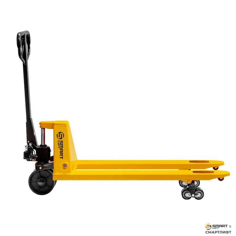 Тележка СМАРТЛИФТ (SMARTLIFT) SD (AC30) PDP оснащена полиуретановыми колесами увеличенного диаметра 180 мм и сдвоенными (тандемными) полиуретановыми роликами, что обеспечивает максимально комфортное передвижение тележки по ровным (наливным) полам. Конструкция крепления сдвоенных роликов позволяет легко преодолевать небольшие неровности, а наличие дополнительного ролика на конце вил делает удобной работу с паллетами поперёк. Для управления тележкой используется обрезиненная эргономичная рукоять с трехпозиционным рычагом.