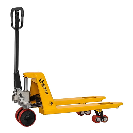 Тележка СМАРТЛИФТ (SMARTLIFT) SD-S (AC25) PDP оснащена полиуретановыми колесами и сдвоенными (тандемными) полиуретановыми роликами, что обеспечивает максимально комфортное передвижение тележки по ровным (наливным) полам. Конструкция крепления сдвоенных роликов позволяет легко преодолевать небольшие неровности, а наличие дополнительного ролика на конце вил делает удобной работу с паллетами поперёк.