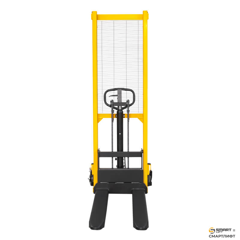 Вилы штабелёра фиксированные, с двойными усилителями. Мачта выполнена из высококачественного стального профиля. Такая система повышает жёсткость конструкции, делает её более устойчивой к износу и, соответственно, увеличивает период службы.